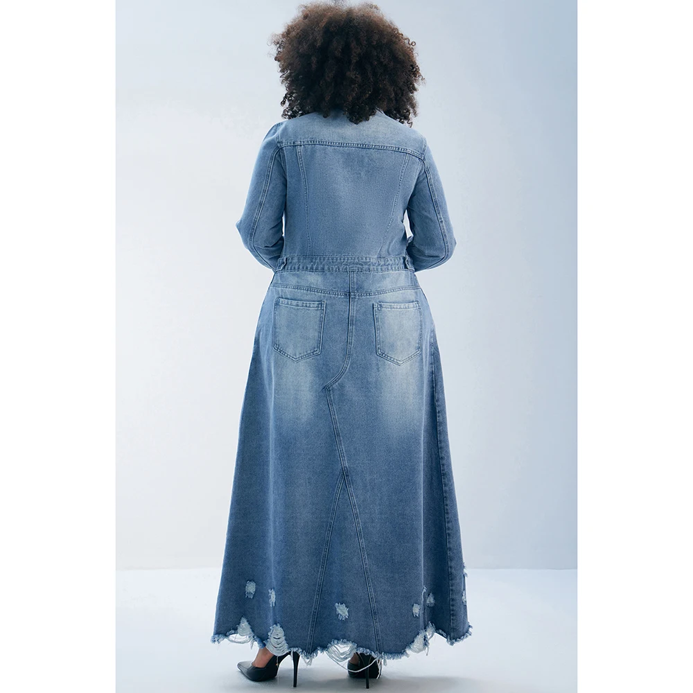 Plus Size Women’s Long Coat Casual Light Blue Long Autumn And Winter Shirt Collar Ripped Slim Denim Coat